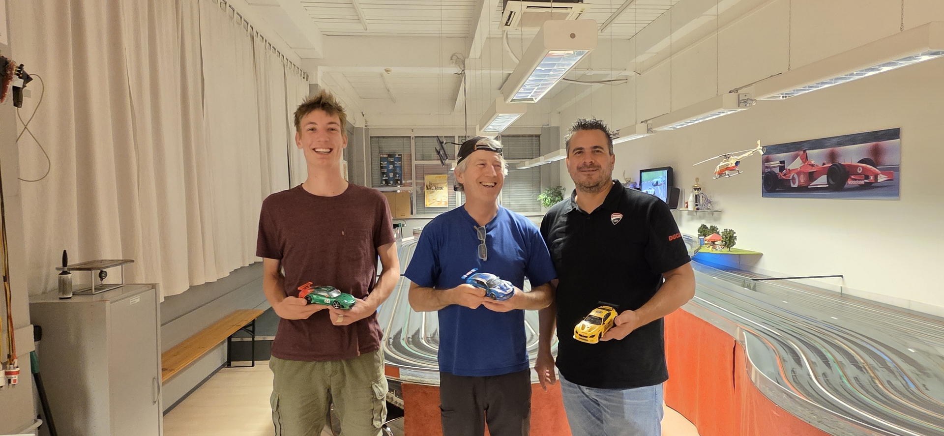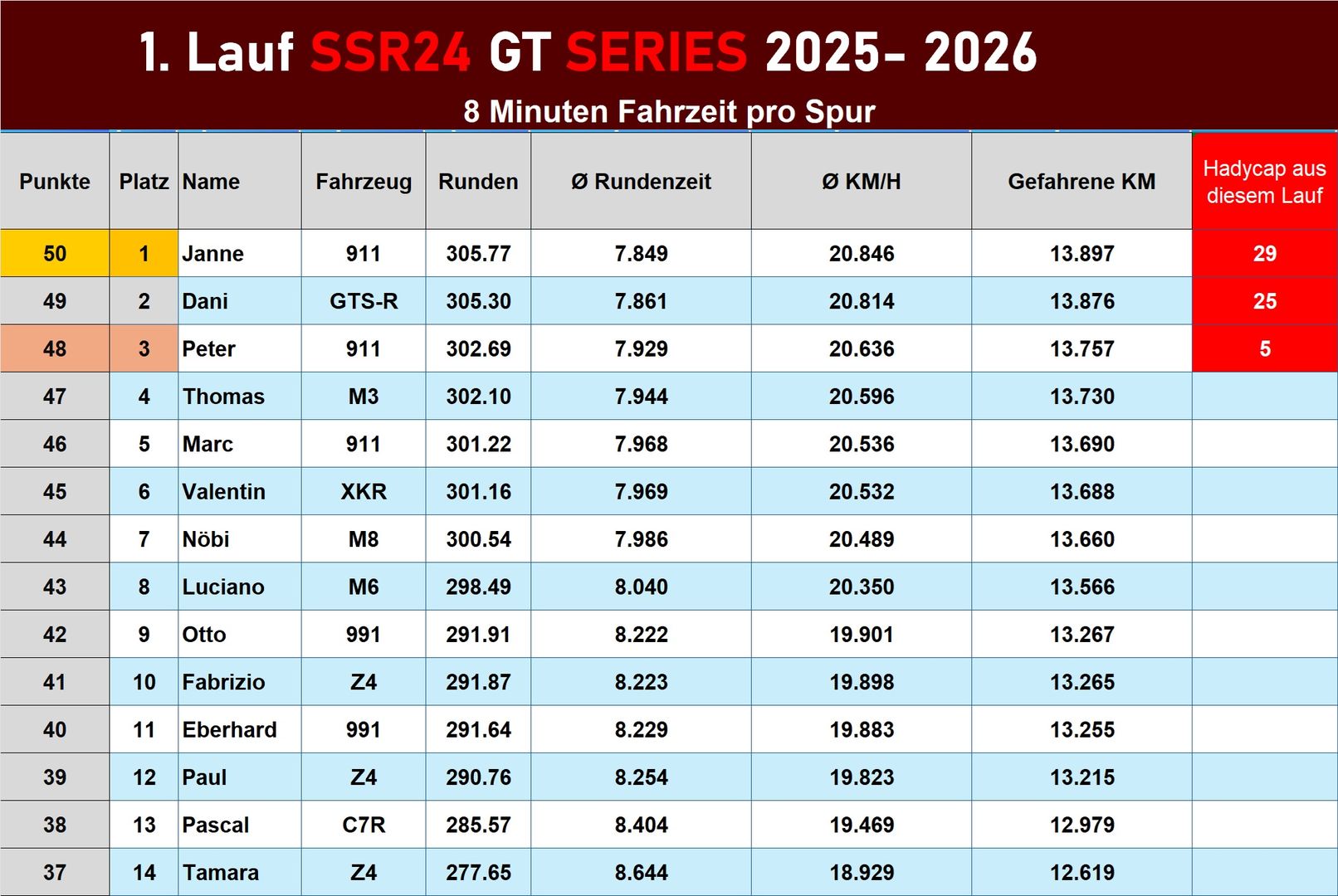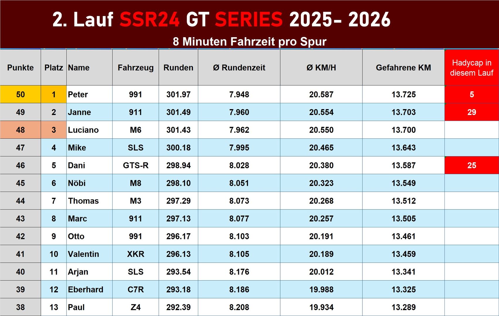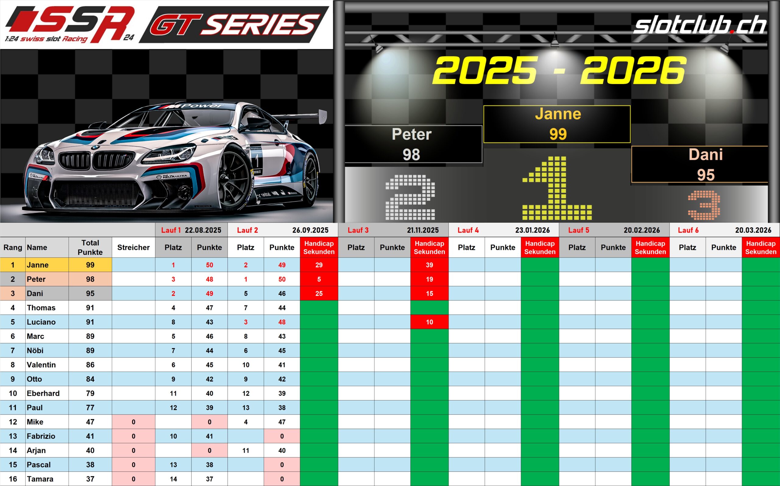 Rangliste SSR24 GT SERIES 2025 - 2026 Meisterschaft-Gesamtwertung SSR24 GT SERIES 2025 - 2026 Club-Weltmeister 20251. Platz: Mike, 2. Platz: Janne, 3. Platz: Peter Die PokaleVon unserem Künstler Peter 6. & Finallauf SSR24 GT SERIES vom 21.03.25 Start gemäss Ausschreibung mit Qualifikationslauf auf Spur Braun.1. Mike (7.783), 2. Janne (7.789), 3. Dani (7.810), 4. Paul (7.862), 5. Peter (7.926),6. Valentin (7.934), 7. Luci (7.941), 8. Michele (7.948), 9. Arjan ( 7.951), 10. Nöbi 7.954, 11. Marc (7.954), 12. Markus (8.065), 13. Michel (8.194), 14. Guido (8.235) Rangliste...und noch mehr Hndicap für den Finallauf Die SiegerDie schnellsten 3 Zieleinlauf Resultate PDF 5. Lauf SSR24 GT SERIES vom 21.02.25 Startaufstellung nach Gesamtklassement, viele Fahrer mit ziemlich viel Handicap… Rangliste...und noch mehr Hndicap für den Finallauf Die SiegerDie schnellsten 3 Zieleinlauf Resultate PDF 4. Lauf SSR24 GT SERIES vom 24.01.25 Startaufstellung nach Gesamtklassement, viele Fahrer mit ziemlich viel Handicap… RanglisteEin harter Kampf um jeden Punkt Die SiegerDie schnellsten 3 Zieleinlauf Resultate PDF 3. Lauf SSR24 GT SERIES vom 22.11.24 Handicap-Regelung sorgt für gute Durchmischung, Startaufstellung nach Gesamtklassement RanglisteEin harter Kampf um jeden Punkt Die SiegerDie schnellsten 3 Zieleinlauf Resultate PDF 2. Lauf SSR24 GT SERIES vom 26.09.25 Erster Lauf mit Handicap, Startaufstellung nach Gesamtklassement RanglisteWhat a Race !!! Die SiegerDie Top-3 aus dem 2. Lauf Zieleinlauf Resultate PDF Impressionen vom 2. Lauf 1. Lauf SSR24 GT SERIES vom 22.08.25 Start nach Qualify: 1. Platz Janne, 2. Platz Dani, 3. Platz Thomas RanglisteCrazy Race vom Start bis zum Ziel Die SiegerDie schnellsten 3, stolz und glücklich Zieleinlauf Resultate PDF BMW M6 (Luci) Special Guest #1 BMW M6 (Nöbi) Special Guest #2 Impressionen vom 1. Lauf Zur Rangliste GT Series Dietlikon 2024