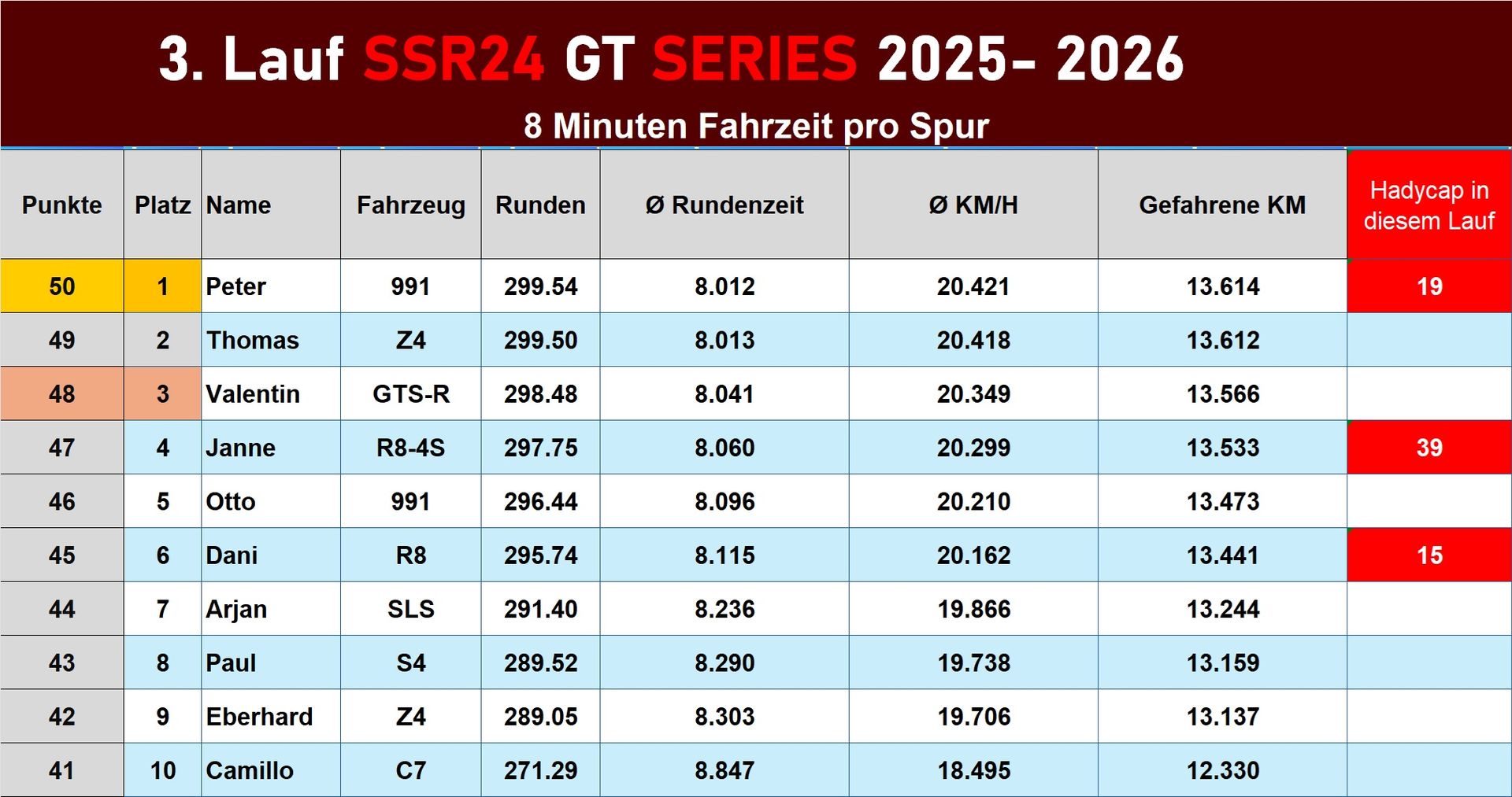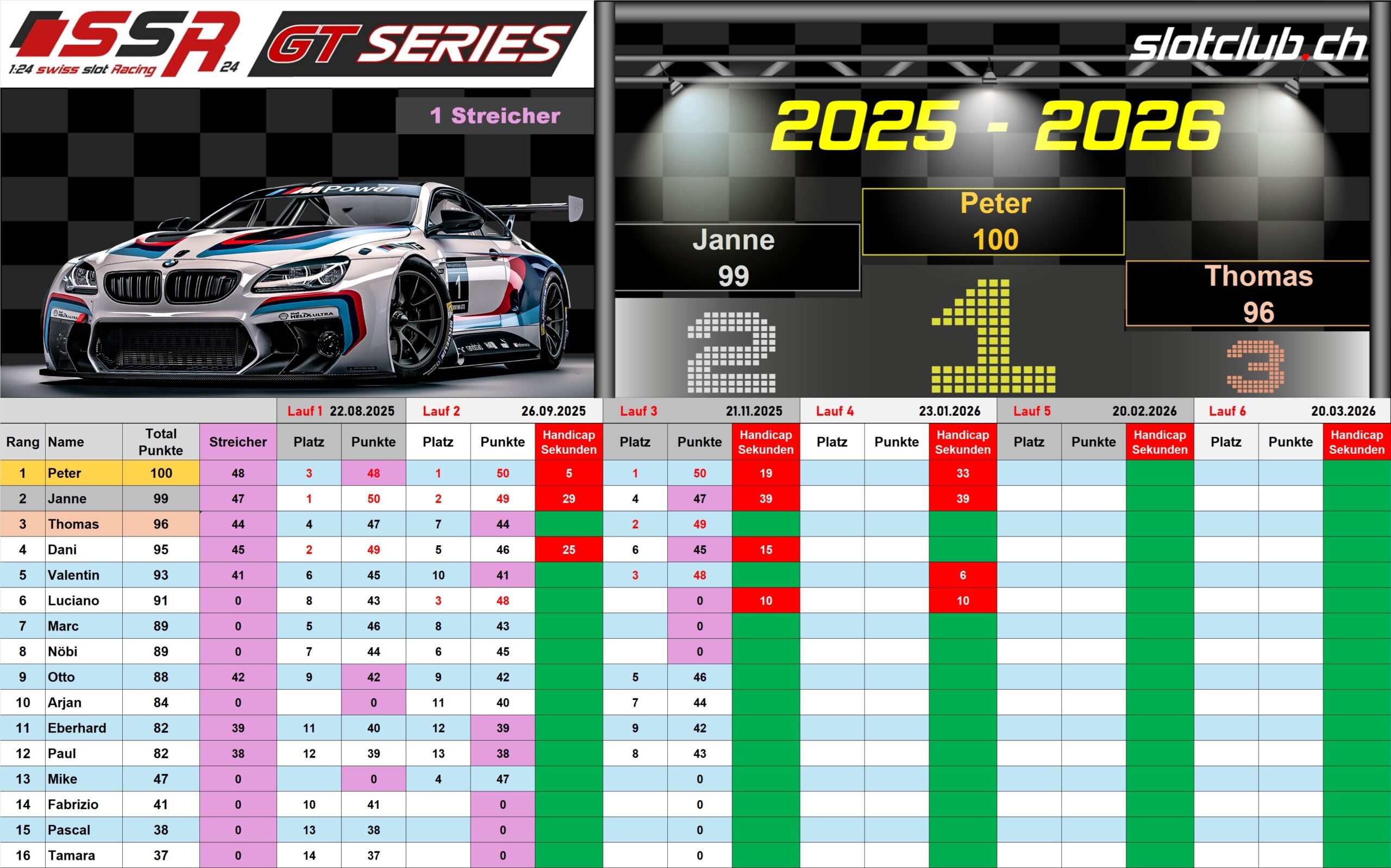 Rangliste SSR24 GT SERIES 2025 - 2026 Meisterschaft-Gesamtwertung SSR24 GT SERIES 2025 - 2026 Club-Weltmeister 20251. Platz: Mike, 2. Platz: Janne, 3. Platz: Peter Die PokaleVon unserem Künstler Peter 6. & Finallauf SSR24 GT SERIES vom 21.03.25 Start gemäss Ausschreibung mit Qualifikationslauf auf Spur Braun.1. Mike (7.783), 2. Janne (7.789), 3. Dani (7.810), 4. Paul (7.862), 5. Peter (7.926),6. Valentin (7.934), 7. Luci (7.941), 8. Michele (7.948), 9. Arjan ( 7.951), 10. Nöbi 7.954, 11. Marc (7.954), 12. Markus (8.065), 13. Michel (8.194), 14. Guido (8.235) Rangliste...und noch mehr Hndicap für den Finallauf Die SiegerDie schnellsten 3 Zieleinlauf Resultate PDF 5. Lauf SSR24 GT SERIES vom 21.02.25 Startaufstellung nach Gesamtklassement, viele Fahrer mit ziemlich viel Handicap… Rangliste...und noch mehr Hndicap für den Finallauf Die SiegerDie schnellsten 3 Zieleinlauf Resultate PDF 4. Lauf SSR24 GT SERIES vom 24.01.25 Startaufstellung nach Gesamtklassement, viele Fahrer mit ziemlich viel Handicap… RanglisteEin harter Kampf um jeden Punkt Die SiegerDie schnellsten 3 Zieleinlauf Resultate PDF 3. Lauf SSR24 GT SERIES vom 21.11.25 Handicap zum Start des 3. Laufes: Peter 19s, Janne 39s, Dani 15s. RanglisteEin harter Kampf um jeden Punkt Die SiegerDie schnellsten 3 Zieleinlauf Resultate PDF Impressionen vom 3. Lauf 2. Lauf SSR24 GT SERIES vom 26.09.25 Erster Lauf mit Handicap, Startaufstellung nach Gesamtklassement RanglisteWhat a Race !!! Die SiegerDie Top-3 aus dem 2. Lauf Zieleinlauf Resultate PDF 1. Lauf SSR24 GT SERIES vom 22.08.25 Start nach Qualify: 1. Platz Janne, 2. Platz Dani, 3. Platz Thomas RanglisteCrazy Race vom Start bis zum Ziel Die SiegerDie schnellsten 3, stolz und glücklich Zieleinlauf Resultate PDF BMW M6 (Luci) Special Guest #1 BMW M6 (Nöbi) Special Guest #2 Impressionen vom 1. Lauf Zur Rangliste GT Series Dietlikon 2024