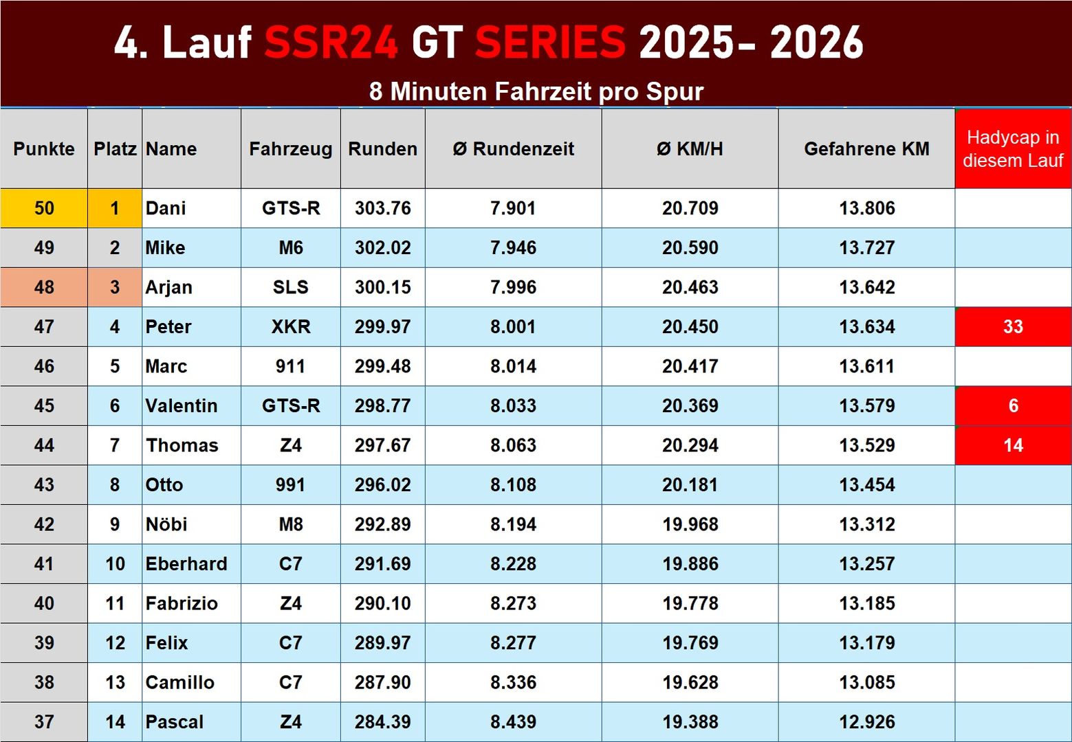 Rangliste SSR24 GT SERIES 2025 - 2026 Meisterschaft-Gesamtwertung SSR24 GT SERIES 2025 - 2026 Club-Weltmeister 20251. Platz: Mike, 2. Platz: Janne, 3. Platz: Peter Die PokaleVon unserem Künstler Peter 6. & Finallauf SSR24 GT SERIES vom 21.03.25 Start gemäss Ausschreibung mit Qualifikationslauf auf Spur Braun.1. Mike (7.783), 2. Janne (7.789), 3. Dani (7.810), 4. Paul (7.862), 5. Peter (7.926),6. Valentin (7.934), 7. Luci (7.941), 8. Michele (7.948), 9. Arjan ( 7.951), 10. Nöbi 7.954, 11. Marc (7.954), 12. Markus (8.065), 13. Michel (8.194), 14. Guido (8.235) Rangliste...und noch mehr Hndicap für den Finallauf Die SiegerDie schnellsten 3 Zieleinlauf Resultate PDF 5. Lauf SSR24 GT SERIES vom 21.02.25 Startaufstellung nach Gesamtklassement, viele Fahrer mit ziemlich viel Handicap… Rangliste...und noch mehr Hndicap für den Finallauf Die SiegerDie schnellsten 3 Zieleinlauf Resultate PDF 4. Lauf SSR24 GT SERIES vom 24.01.26 Startaufstellung nach Gesamtklassement, neuer M6 fährt aufs Treppchen, neuer Member im 300er Club, alter Hase gewinnt den 4. Lauf RanglisteAlles extrem nah zusammen Die Sieger2 alte Hasen und ein neues 300er Mitglied Startgrid Gruppe 1Gemischtes Straterfeld Startgrid Gruppe 22x CR7 3x BMW Zieleinlauf Resultate PDF Impressionen vom 3. Lauf 3. Lauf SSR24 GT SERIES vom 21.11.25 Handicap zum Start des 3. Laufes: Peter 19s, Janne 39s, Dani 15s. RanglisteEin harter Kampf um jeden Punkt Die SiegerDie schnellsten 3 Zieleinlauf Resultate PDF Impressionen vom 3. Lauf 2. Lauf SSR24 GT SERIES vom 26.09.25 Erster Lauf mit Handicap, Startaufstellung nach Gesamtklassement RanglisteWhat a Race !!! Die SiegerDie Top-3 aus dem 2. Lauf Zieleinlauf Resultate PDF 1. Lauf SSR24 GT SERIES vom 22.08.25 Start nach Qualify: 1. Platz Janne, 2. Platz Dani, 3. Platz Thomas RanglisteCrazy Race vom Start bis zum Ziel Die SiegerDie schnellsten 3, stolz und glücklich Zieleinlauf Resultate PDF BMW M6 (Luci) Special Guest #1 BMW M6 (Nöbi) Special Guest #2 Impressionen vom 1. Lauf Zur Rangliste GT Series Dietlikon 2024