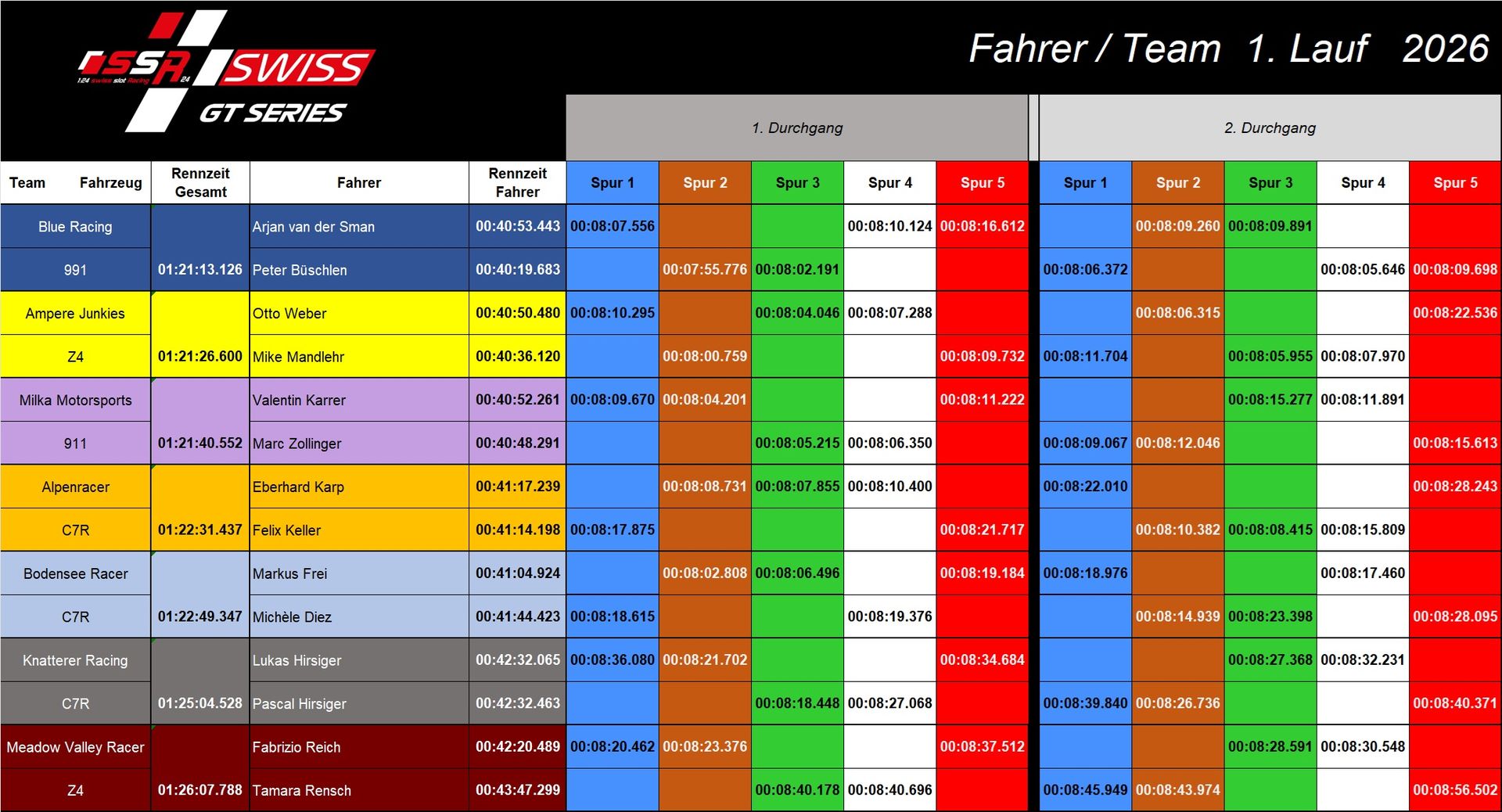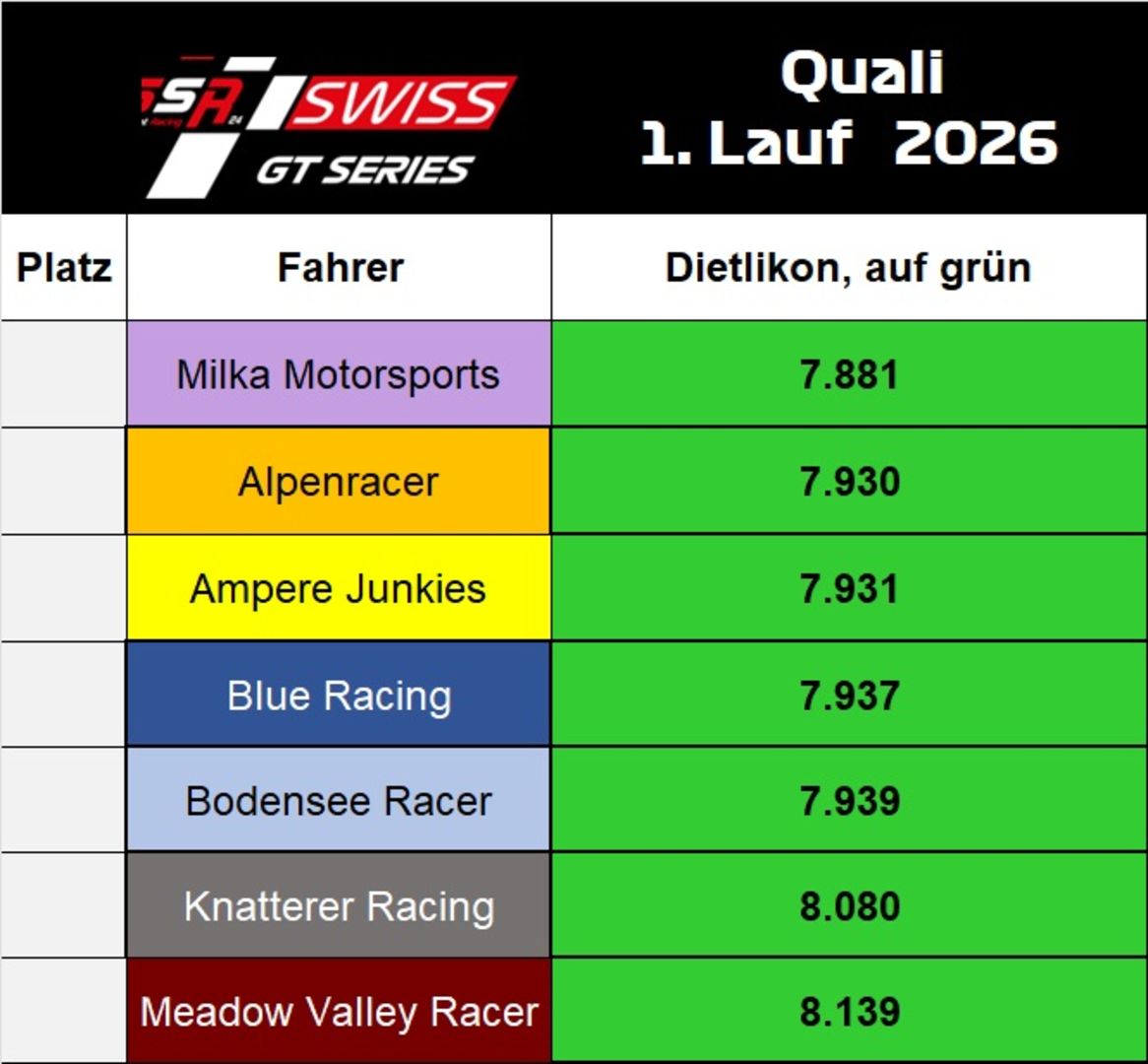 Gesamtrangliste SSR24 SWISS GT SERIES 2026 Team Gesamtwertung 2026Teamwertung nach allen gefahrenen Läufen in der Kategorie "SSR24 SWISS GT Series" Fahrer Gesamtwertung 2026Rangliste Fahrerwertung nach allen gefahrenen Läufen in der Kat. "SSR24 SWISS GT Series" Teamwertung Ampere Junkies1. Platz Bodensee Racer2. Platz Alpen-Racer3. Platz Bodensee Racer4. Platz Zürispeed5. Platz Knatterer6. Platz Fahrerwertung Fabrizio1. Platz Marc2. Platz Markus3. Platz 3. Renntag SSR24 SWISS GT Series - 03.10.26 Egnach Qualify: 1. MRC-Chur, 2. Domino, 3. Bodensee-Racer Rennübersicht Rangliste FahrerNeue Fahrer ganz weit oben in der Einzelwertung Die Rennboliden beim 3. LaufAlle Marken vertreten - schön durchmischt Impressionen vom 3. Lauf zur SSR24 SWISS GT Series 2025 2. Renntag SSR24 SWISS GT Series - 13.06.26 Chur Qualify: 1. Alpen Racer, 2. Bodensee Racer, 3. Knatterer Rennübersicht Rangliste FahrerNeue Fahrer ganz weit oben in der Einzelwertung 1. PlatzKnatterer 2. PlatzMRC Chur 3. PlatzBodensee Racer 4. PlatzAmpere Junkies 5. PlatzAlpen Racer 6. PlatzZürispeed 7. PlatzRacing Brothers ZieleinlaufEin spannendes Rennen geht zu Ende 1. Renntag SSR24 SWISS GT Series - 07.03.26 DIETLIKON Qualify: 1. Milka Motorsport, 2. Alpen Racer, 3. Ampere-Junkies Rangliste TeamDurchmischte Hersteller-Rangliste Rangliste FahrerTop 6 Fahrer innerhalb 30Sekunden 1. PlatzTeam Blue Racing 2. PlatzTeam Ampere-Junkies 3. PlatzTeam Milka Rennsport 4. PlatzTeam Alpen Racer 5. PlatzTeam Bodensee Racer 6. PlatzTeam Knatterer 7. PlatzTeam Meadow Valley Racer 8. PlatzQualify Ergebnis RundenübersichtFahrer/Team Rundenübersicht 1. Lauf Rennresultate 2. Lauf Rennresultate Impressionen vom 1. Lauf zur SSR24 SWISS GT Series 2026 Zur Rangliste SWISS GT Series 2025